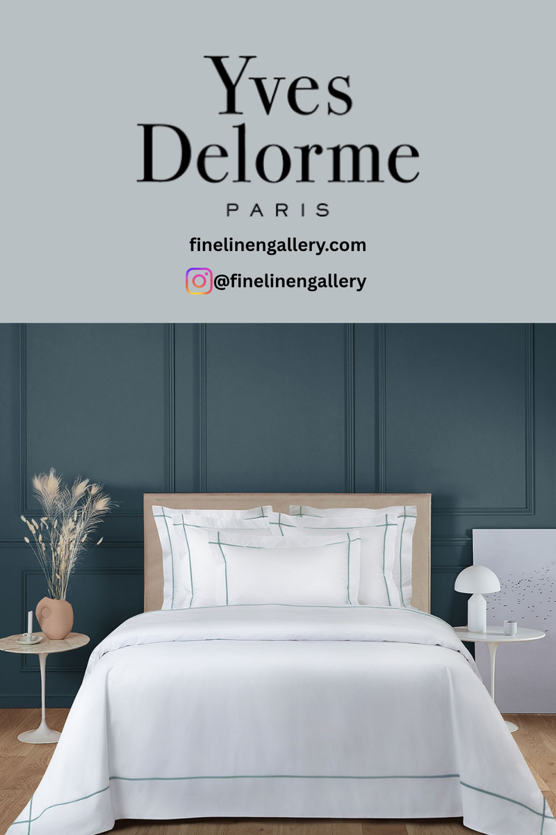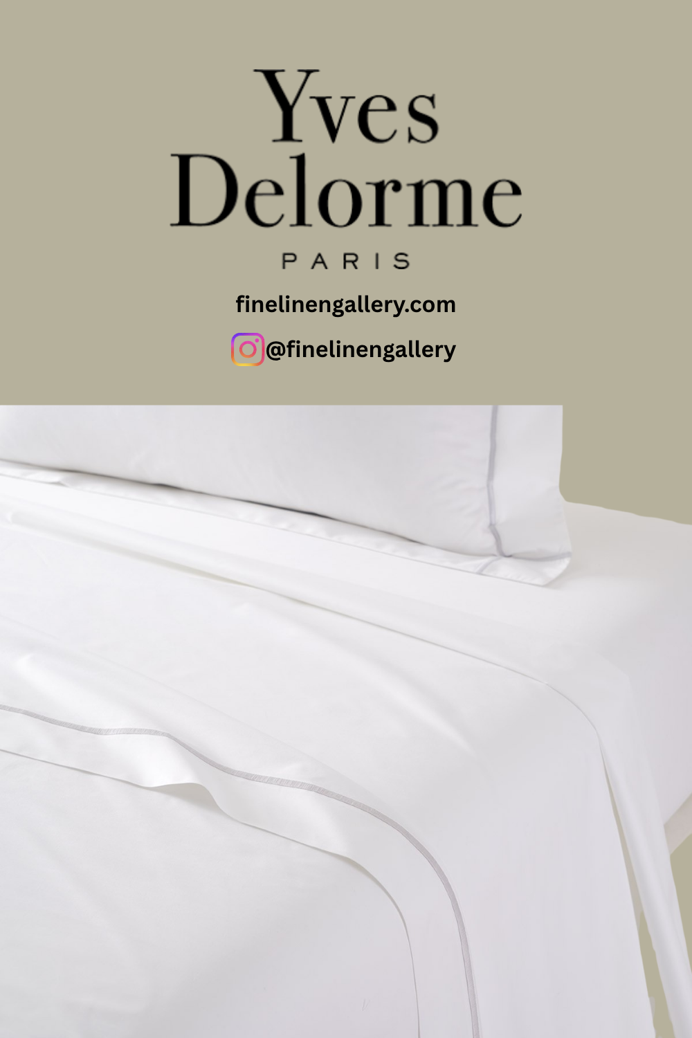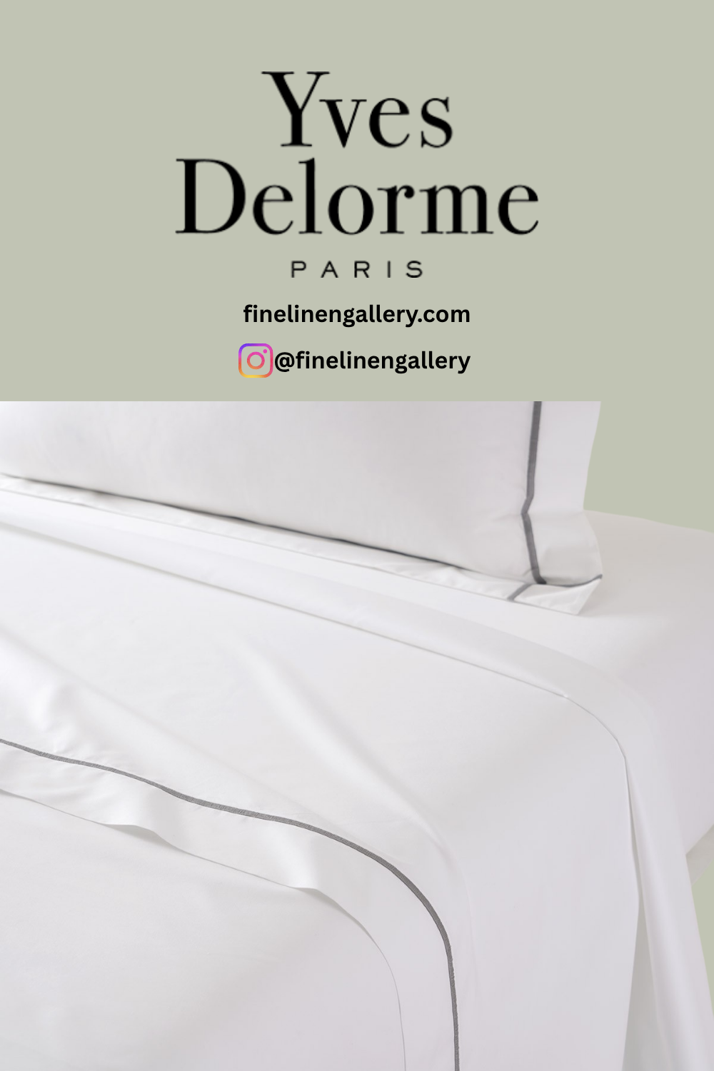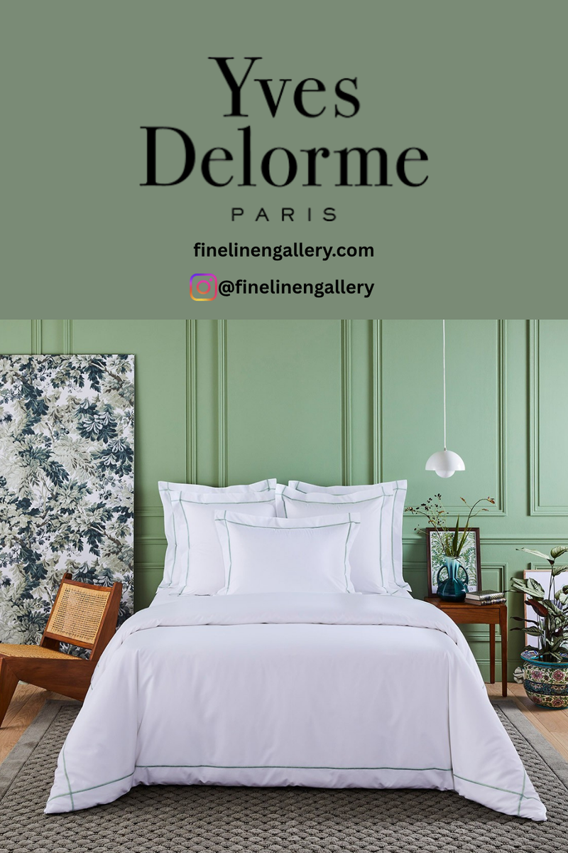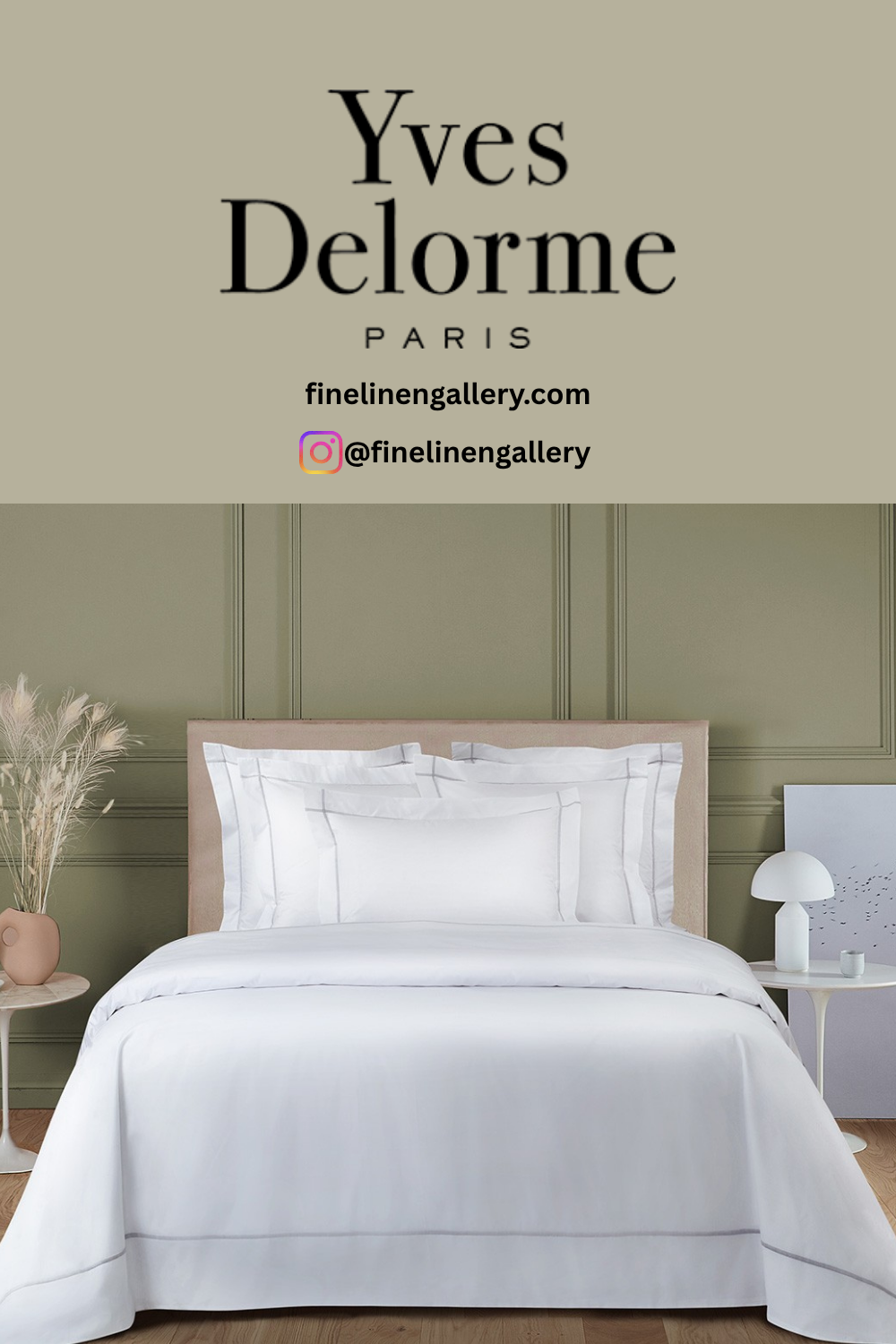 Athéna, goddess of handicraft and weaving, inspires and signs the luxurious identity of this Yves Delorme timeless classic design. A crisp, resistant, sophisticated, and matte finish guarantees the excellent quality of this textile. The pure graphic expression of a colored bourdon stitch frames the flanged pillow shams and duvet cover in an elegant gesture of crossed lines.