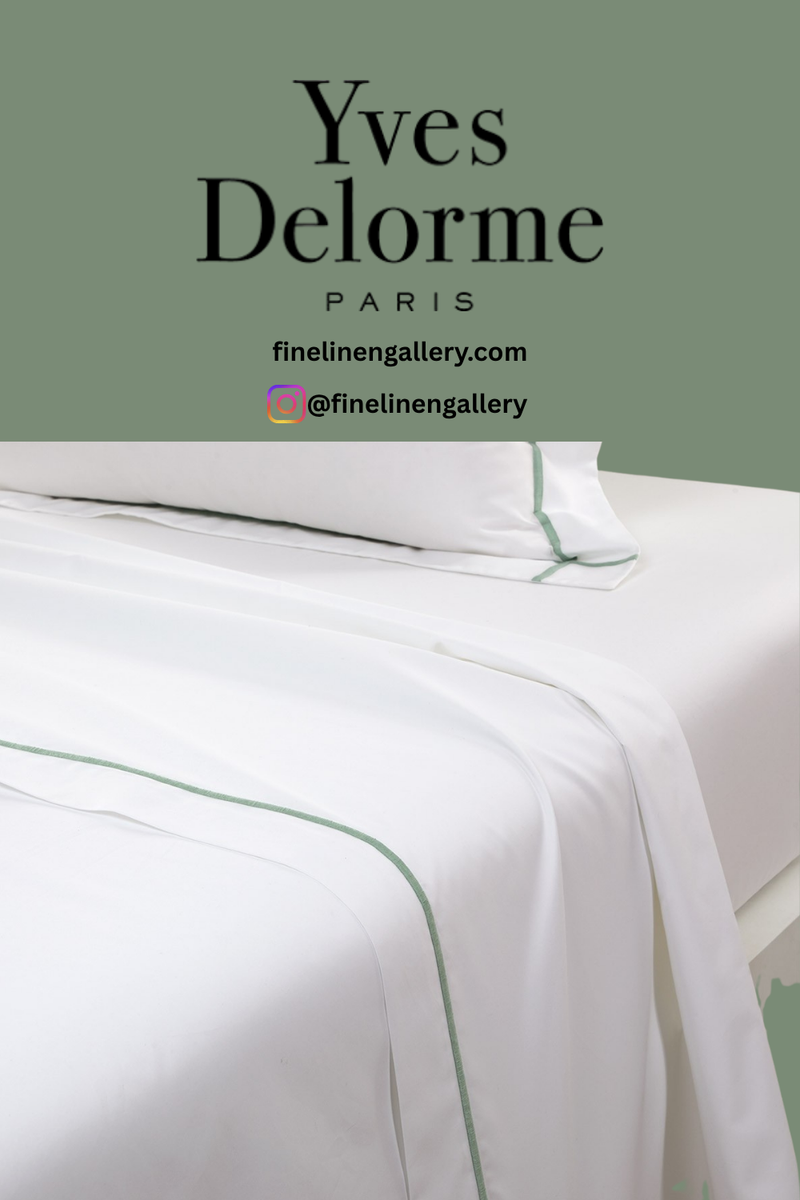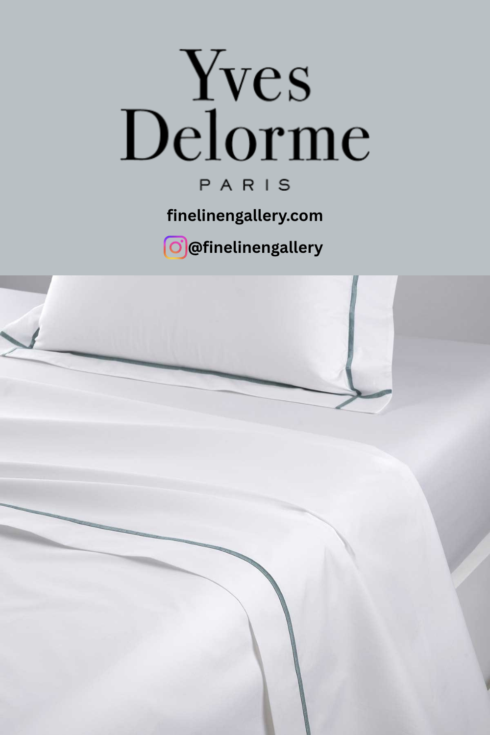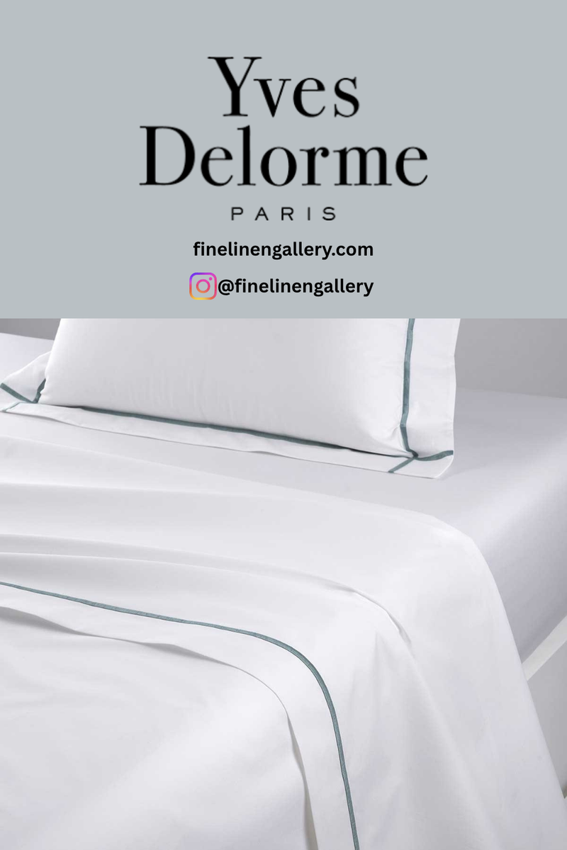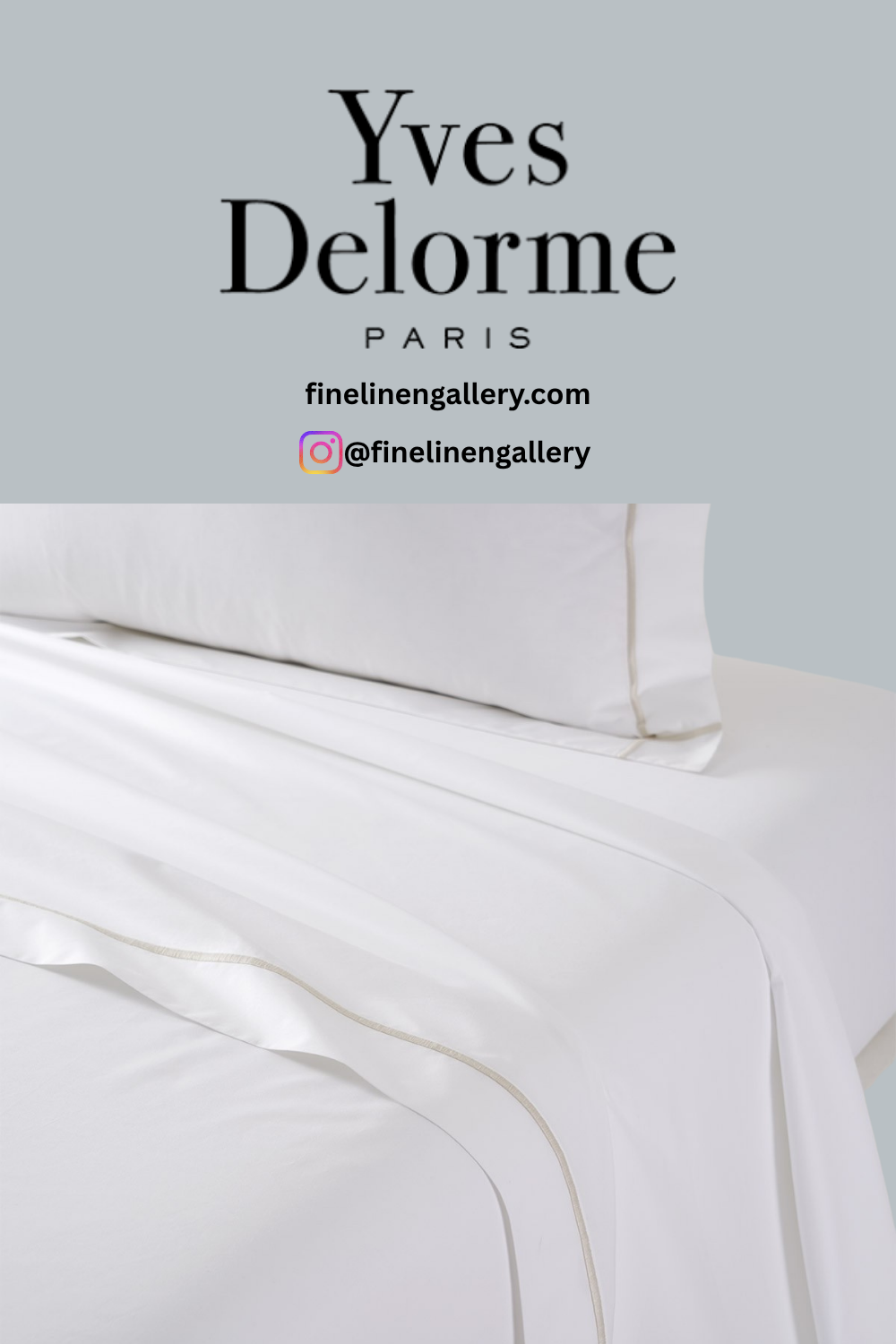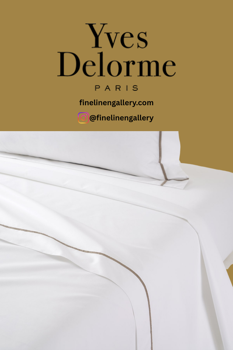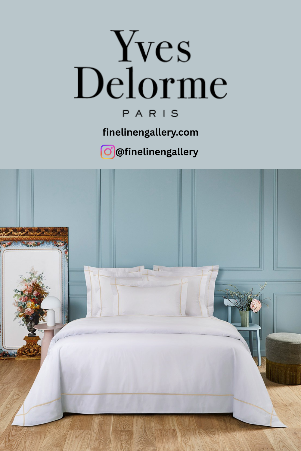 Athéna, goddess of handicraft and weaving, inspires and signs the luxurious identity of this Yves Delorme timeless classic design. A crisp, resistant, sophisticated, and matte finish guarantees the excellent quality of this textile. The pure graphic expression of a colored bourdon stitch frames the flanged pillow shams and duvet cover in an elegant gesture of crossed lines.