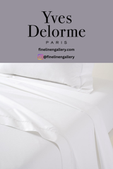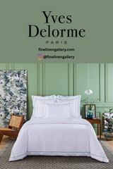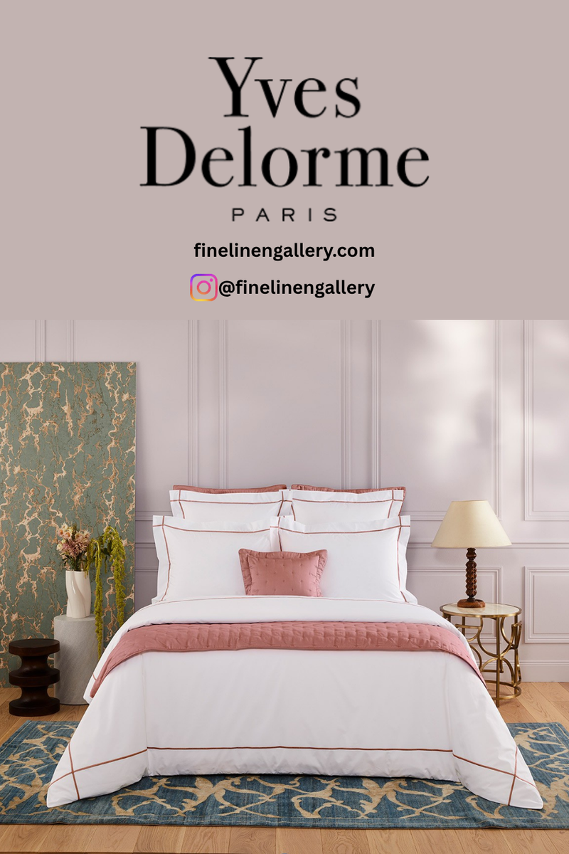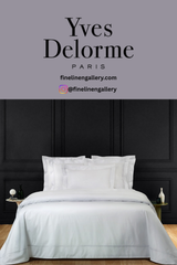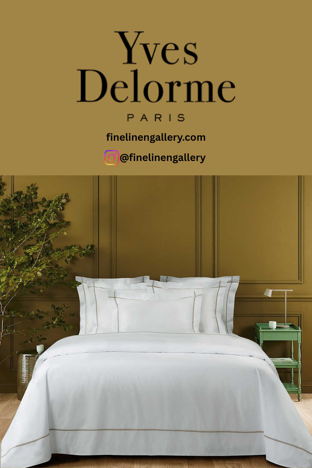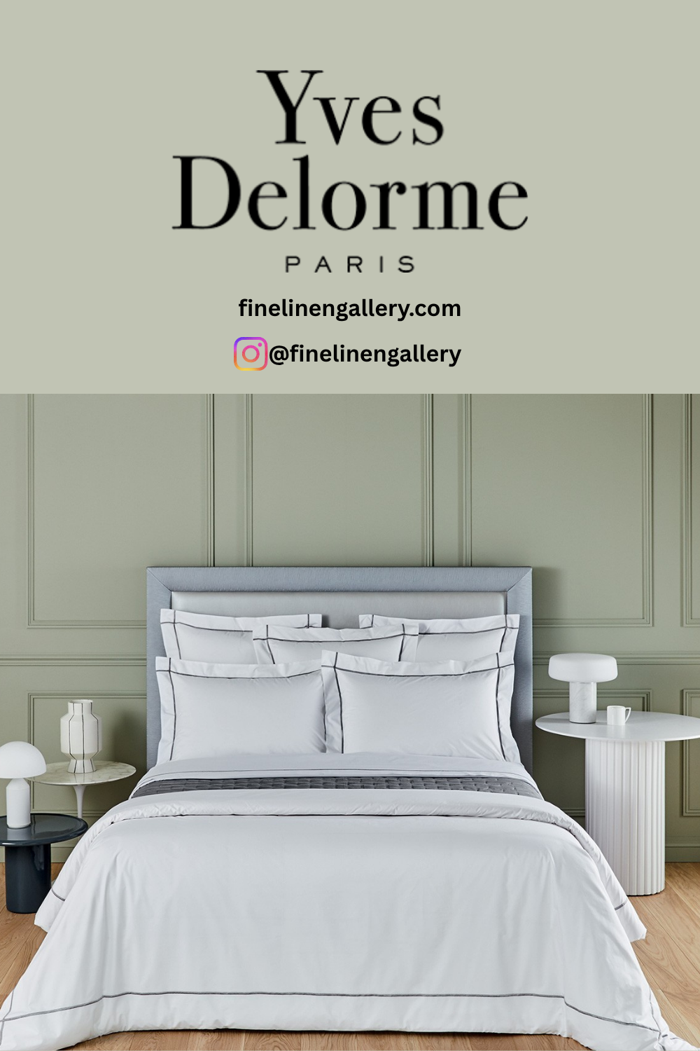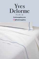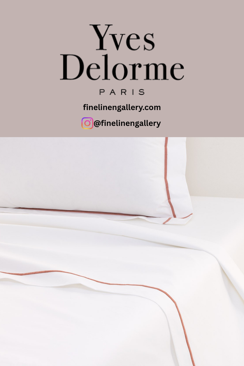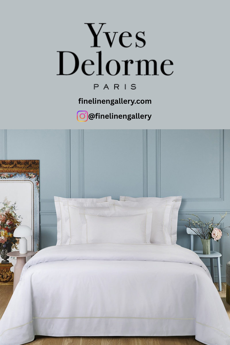 Athéna, goddess of handicraft and weaving, inspires and signs the luxurious identity of this Yves Delorme timeless classic design. A crisp, resistant, sophisticated, and matte finish guarantees the excellent quality of this textile. The pure graphic expression of a colored bourdon stitch frames the flanged pillow shams and duvet cover in an elegant gesture of crossed lines.