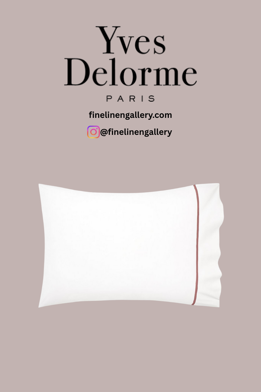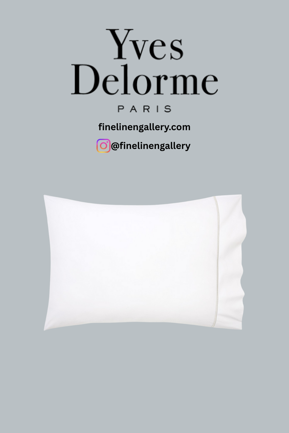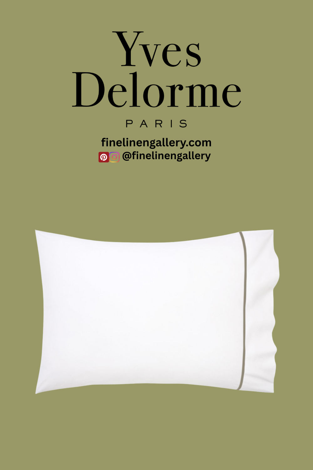 Athéna, goddess of handicraft and weaving, inspires and signs the luxurious identity of this Yves Delorme timeless classic design. A crisp, resistant, sophisticated, and matte finish guarantees the excellent quality of this textile. The pure graphic expression of a colored bourdon stitch frames the flanged pillow shams and duvet cover in an elegant gesture of crossed lines.
