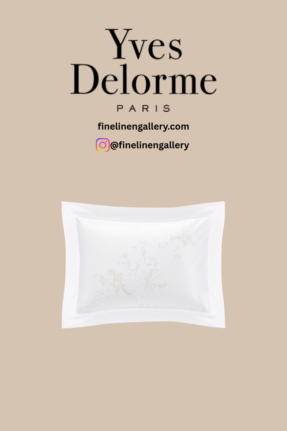 Bagatelle unveils on sateen the contours of a quiet nature, where each white embroidery appears suspended in light. The design, both delicate and ethereal, evokes an imagined vegetation, captured in the moment of a gentle breeze.