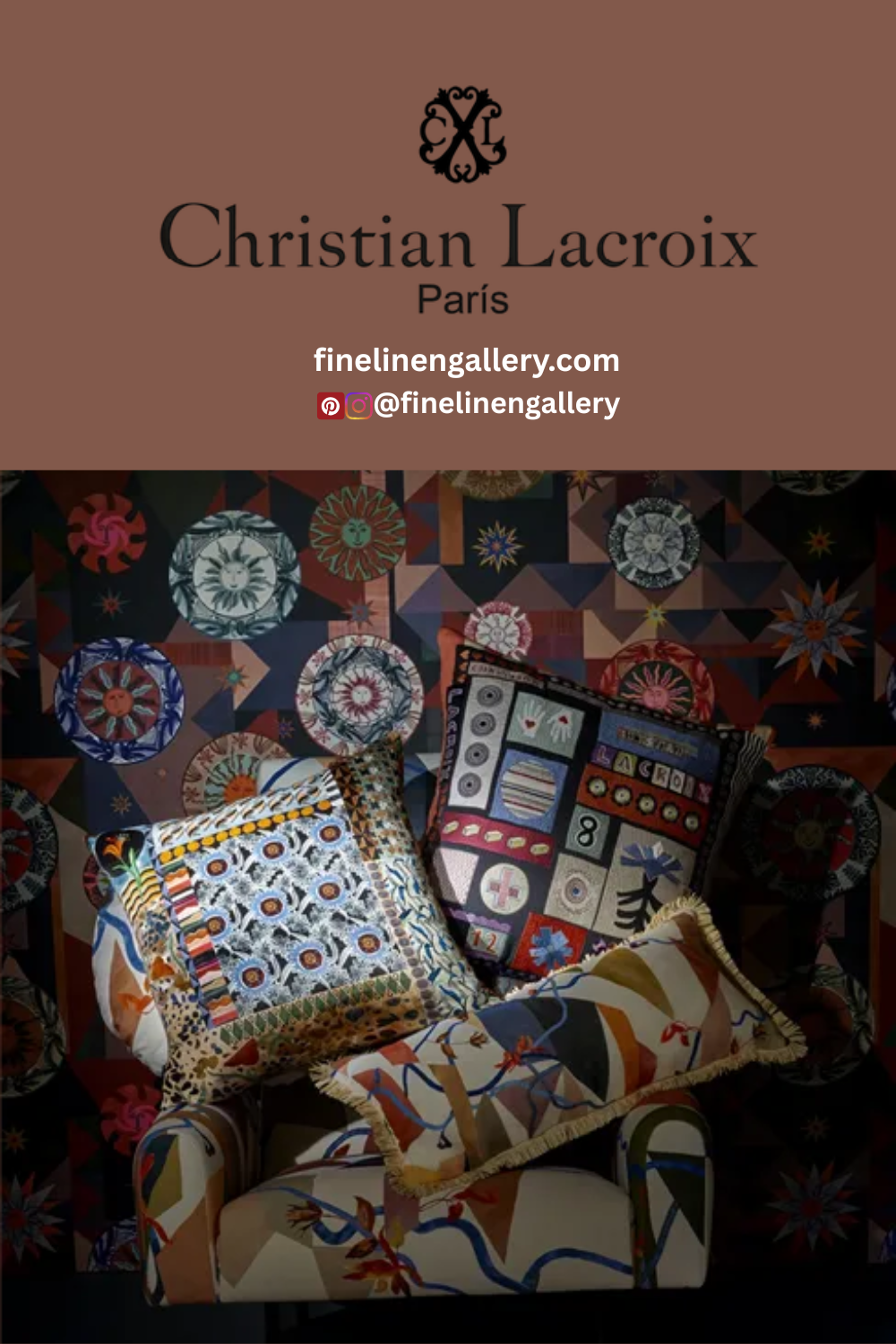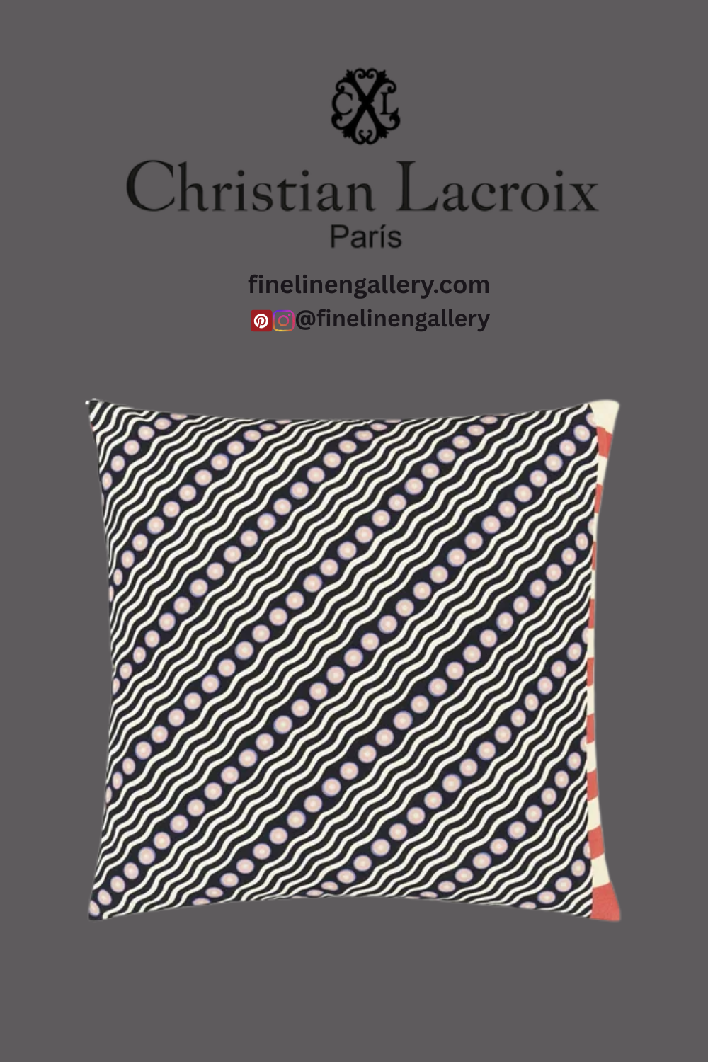 Iconic graphic Christian Lacroix words and motifs are intricately embroidered onto a digitally printed cotton sateen ground in this large square decorative pillow. A striking graphic pattern is digitally printed onto pure cotton sateen on the reverse of this luxurious designer interior decorative pillow.