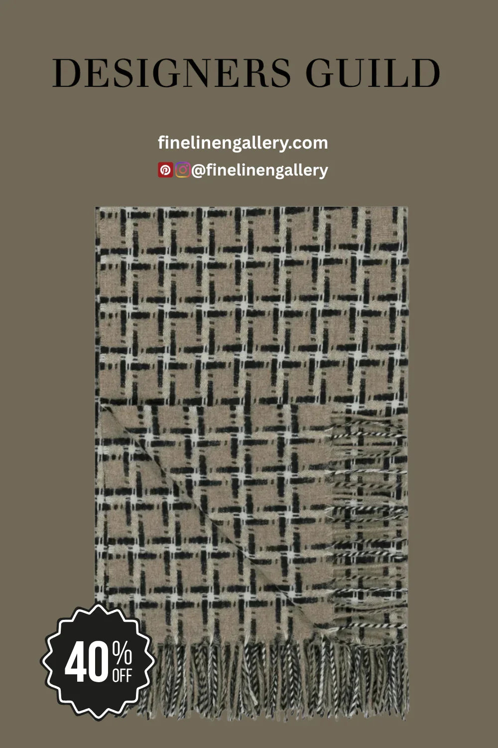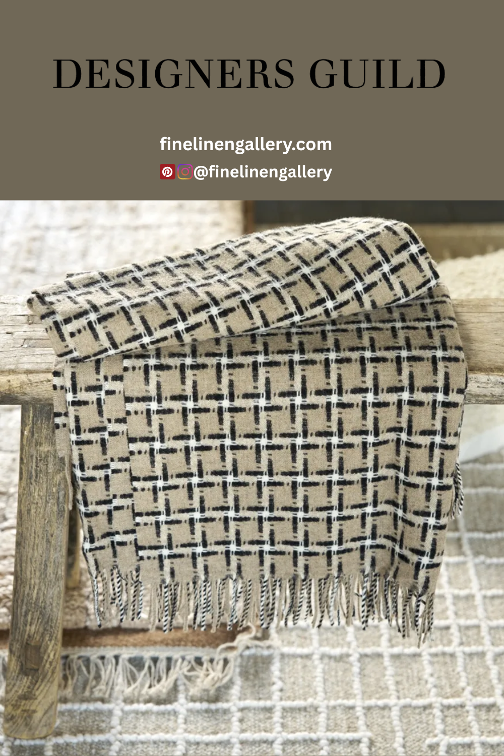 This elegant throw is woven with a small-scale geometric grid pattern in graphic shades of linen white and inky black. Woven in luxurious merino wool this sophisticated throw is incredibly soft to the touch and finished with a fringed edge.