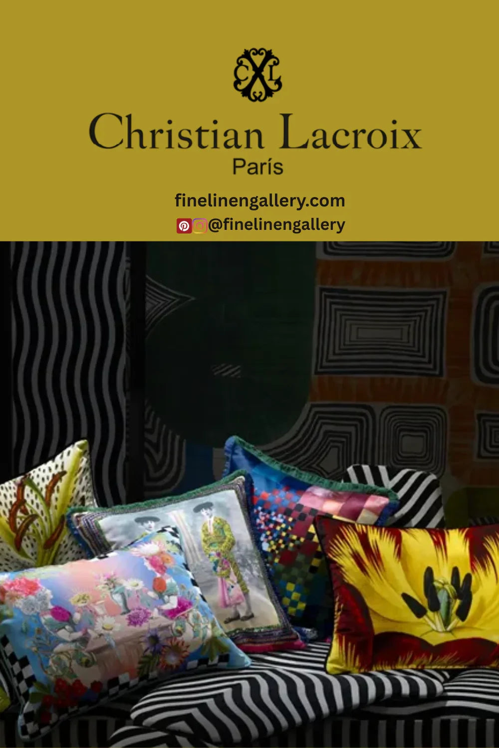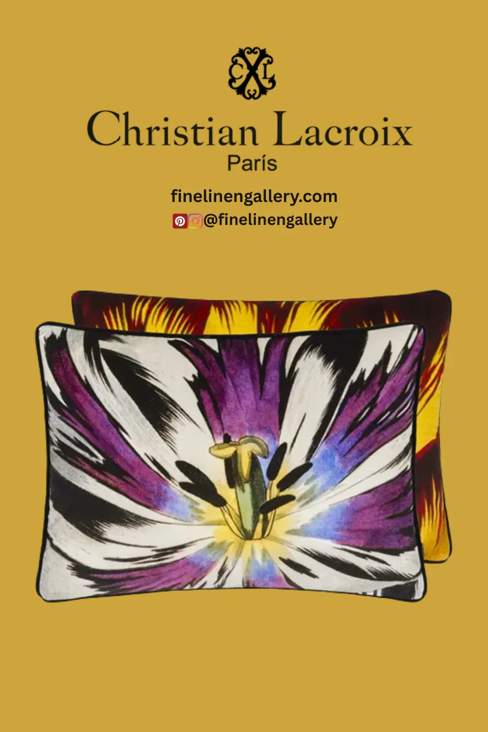 This large rectangular decorative pillow by Christian Lacroix Maison, features a close-up view of a botanical flower illustration. Digitally printed onto luxurious velvet and finished with black velvet piping on all sides.