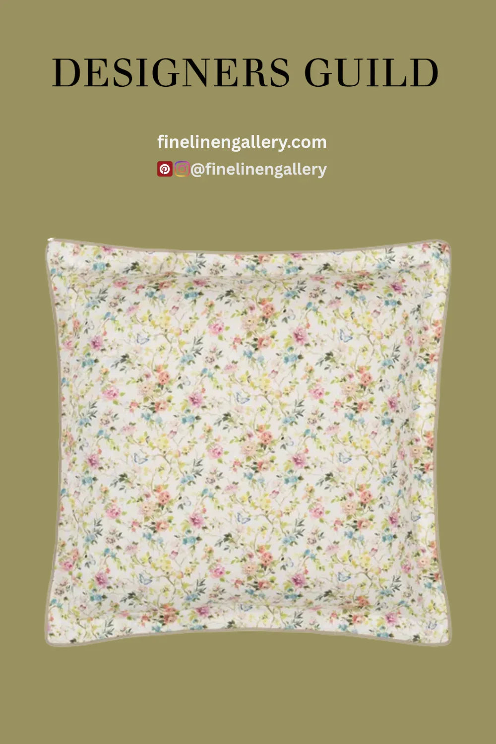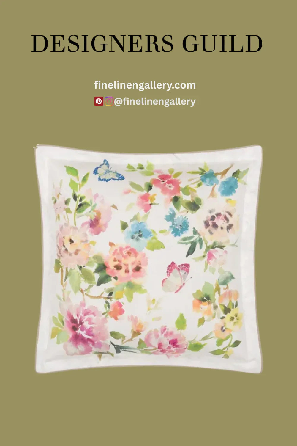 Soft and delicately painted flowers and butterflies in inky water color tones. This medium scale floral bed linen design is fully reversible to an all-over floral print in a smaller scale. Shams finished with a sophisticated birch trim. Digitally printed onto luxurious cotton sateen.