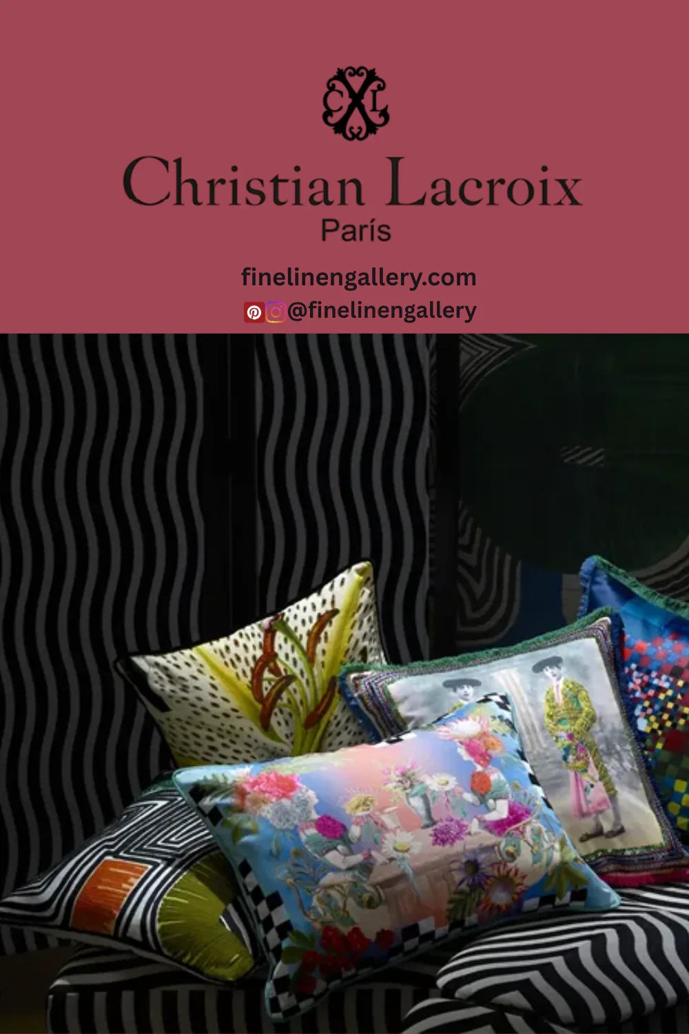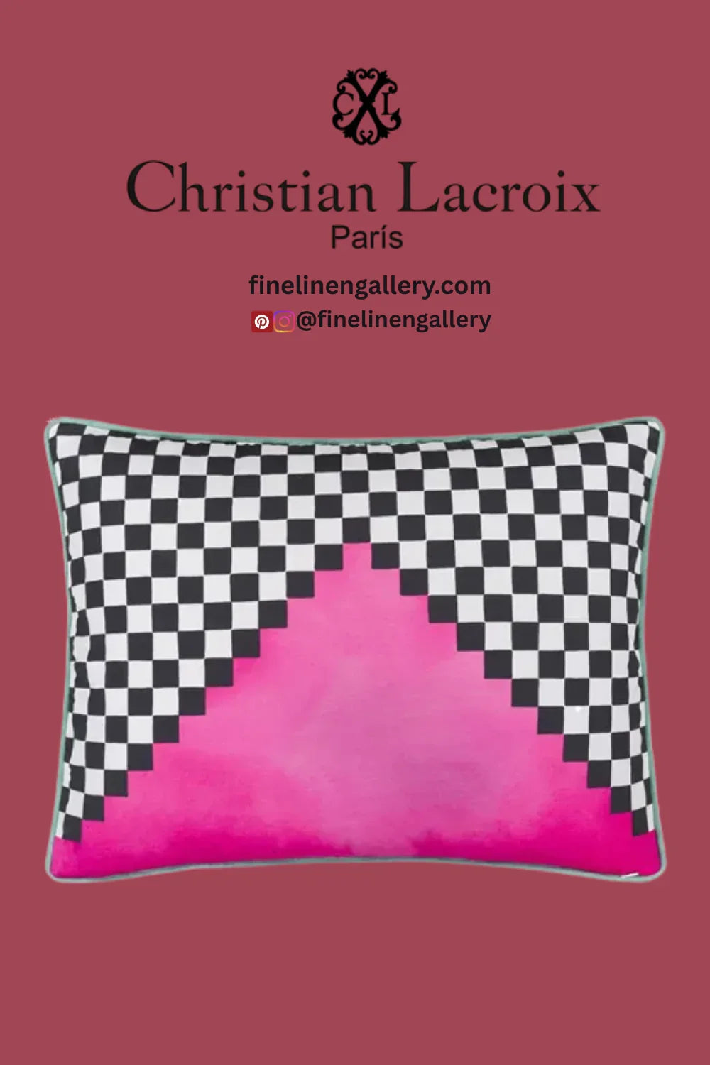 A wonderful large rectangular decorative pillow is digitally printed and embellished with embroidery onto a sleek cotton satin - a delightful pair of ladies meet for afternoon tea and are adorned with an abundance of flora and fauna. In typical Christian Lacroix style, the illustration is interrupted with a graphic embroidered pattern which is taken onto the reverse with a dash of bright fuchsia pink. Finished on all sides with a pale green velvet piping.