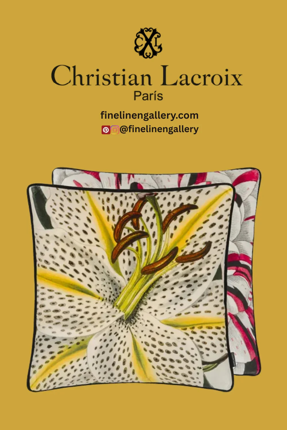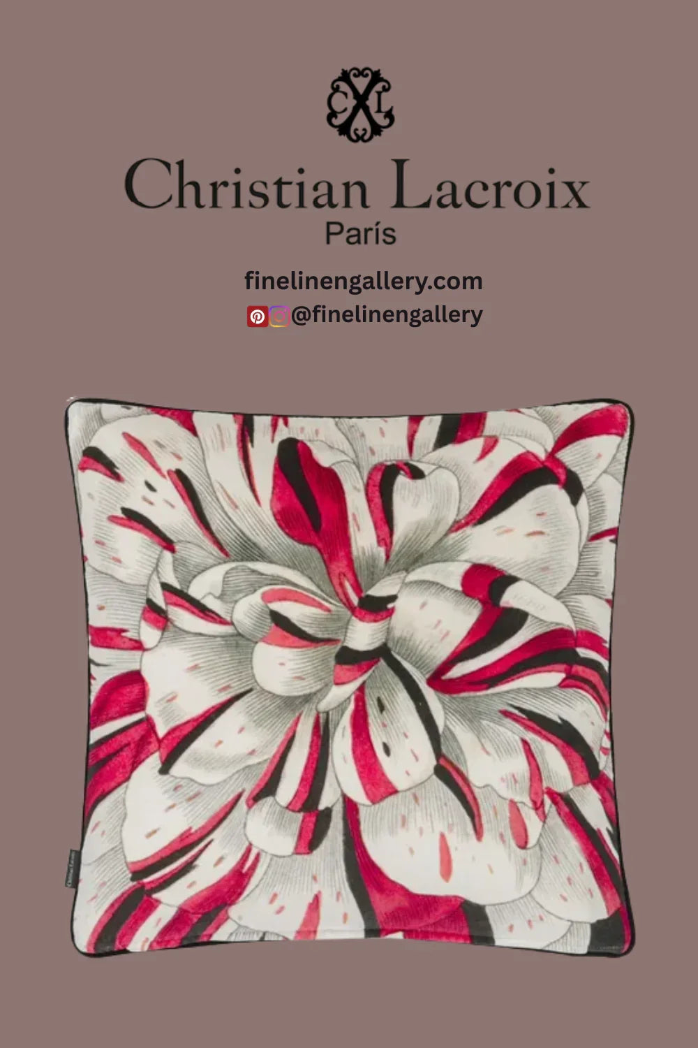 This large square decorative pillow by Christian Lacroix Maison, features a close-up view of a botanical flower illustration. Digitally printed onto luxurious velvet and finished with black velvet piping on all sides.