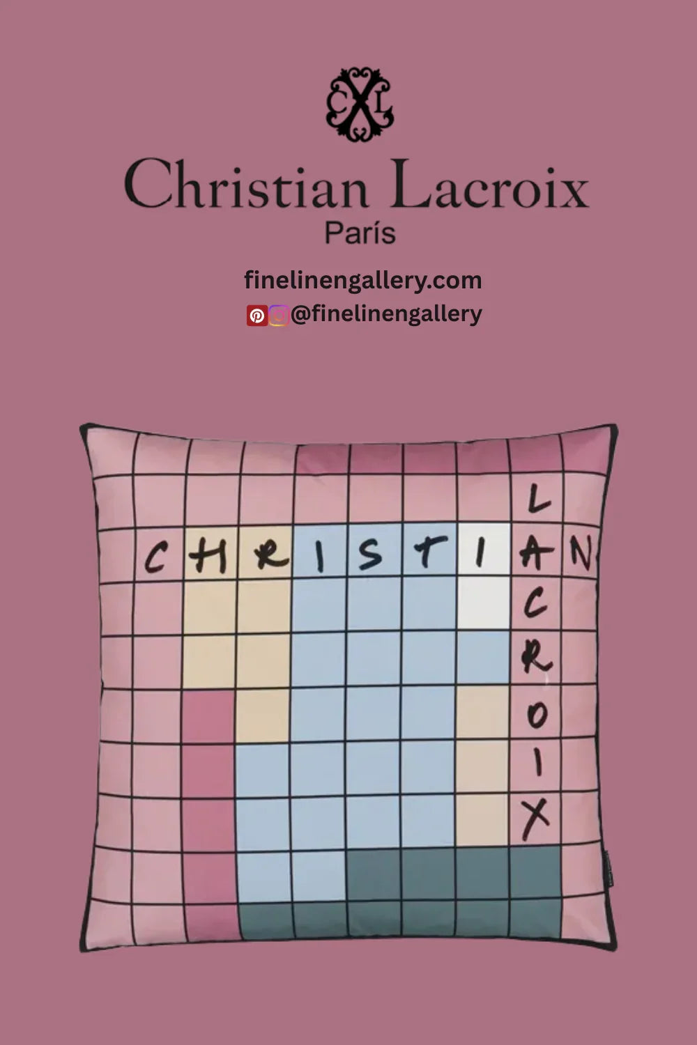 Wondrous flowing forms are filled with marbleised patterns in this contemporary, graphic decorative pillow by Christian Lacroix Maison. Reversing to a tiled pattern digital print with Christian Lacroix lettering. Printed on sleek cotton satin.