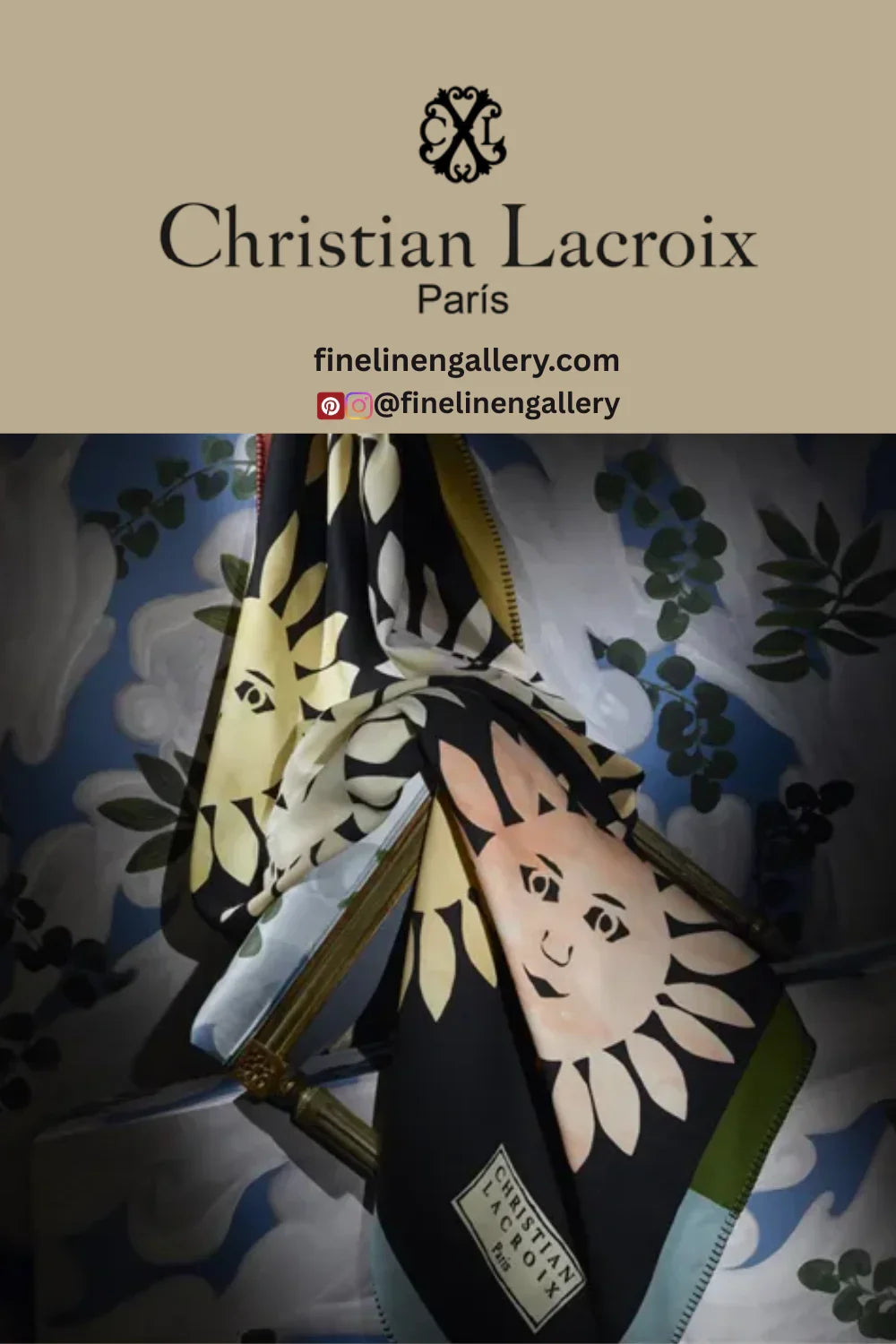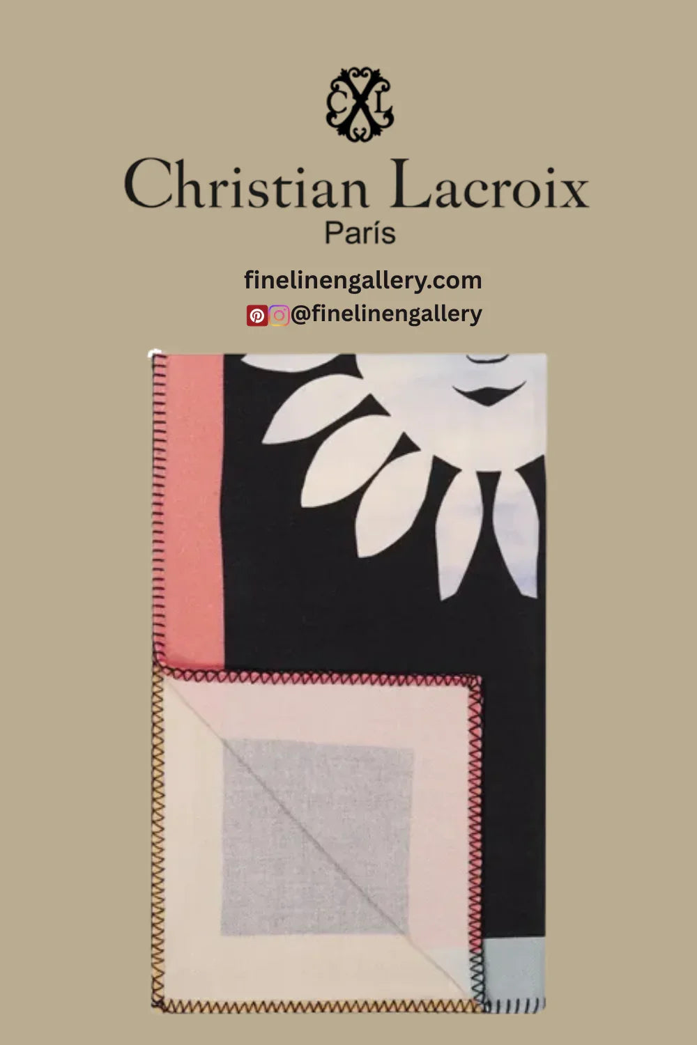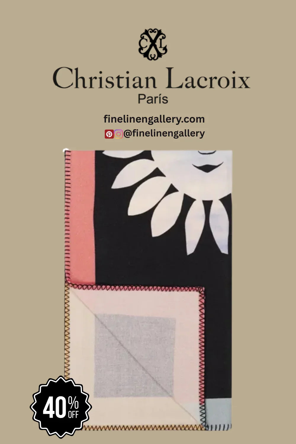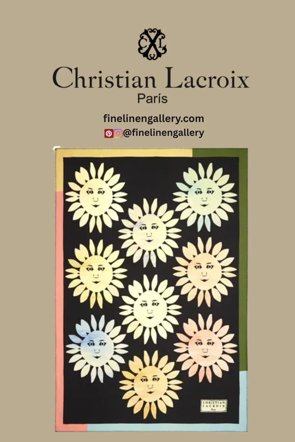 This playful interior throw will be sure to put a smile of your face. The sun is happy to be out on this graphic interior throw by Christian Lacroix. With inky washes of colour set on a graphic black ground, this contemporary throw is digitally printed onto pure merino wool and finished with a black blanket stitch edge on all four sides.