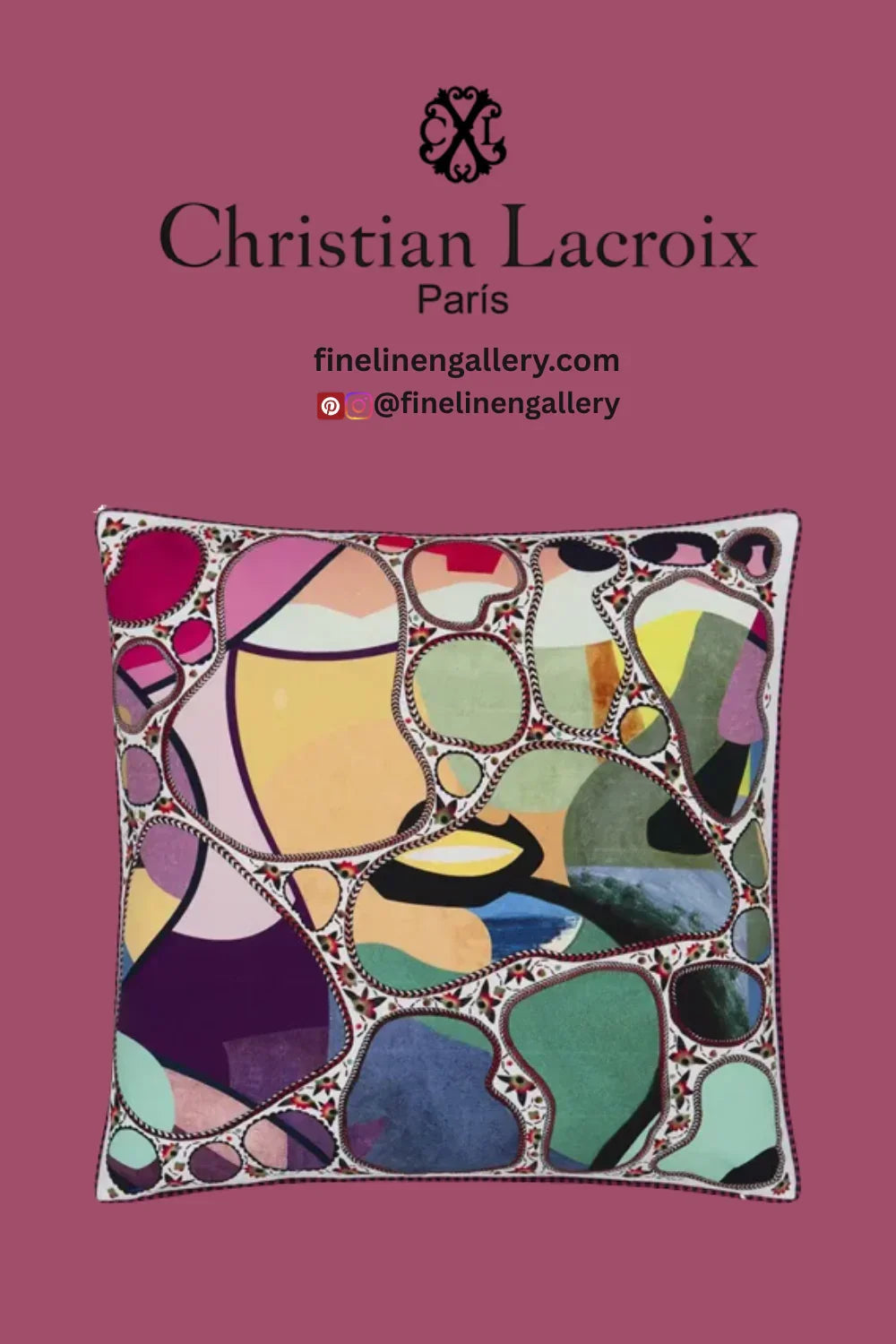 The sun is happy to be out and will be sure to out a smile on your face with this graphic decorative pillow by Christian Lacroix. In resplendent gold foil the suns face is highlighted with embroidered stitching against the contrasting black ground. This contemporary interior decorative pillow is completed with a colourful marbleised pattern on the reverse.