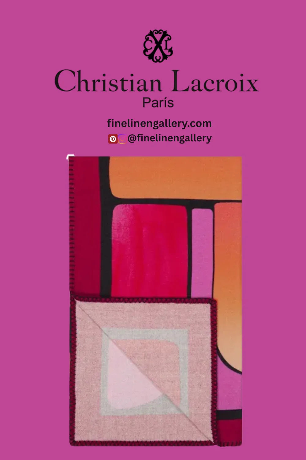 Rich and bold geometric shapes are cleverly tiles together in deep magenta and red tones. In contrast with the black in the ground, this interior throw by Christian Lacroix is digitally printed onto luxurious pure merino wool and finished with a black blanket stitch edge on all four sides.