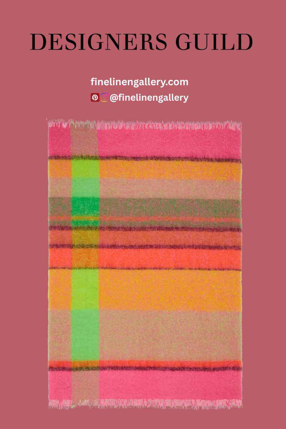 A wondrous large scale striped interior throw woven in mohair and brushed for luxurious softness. In sophisticated coral pink and lime green tones and finished with a fringed edge.