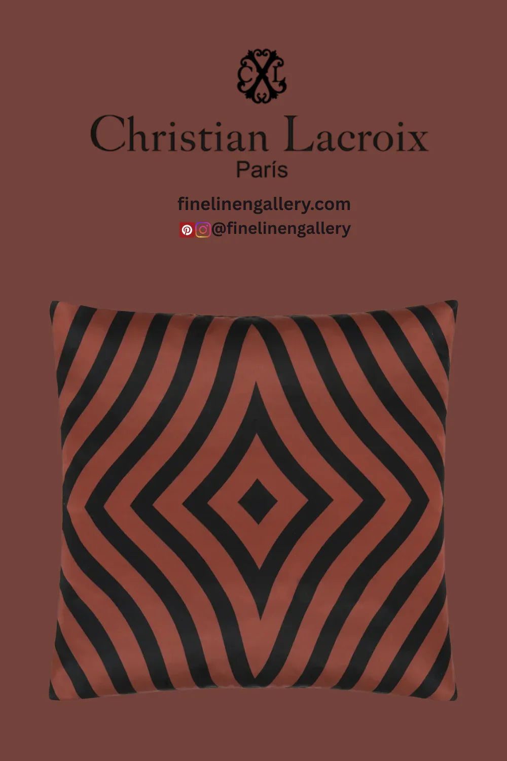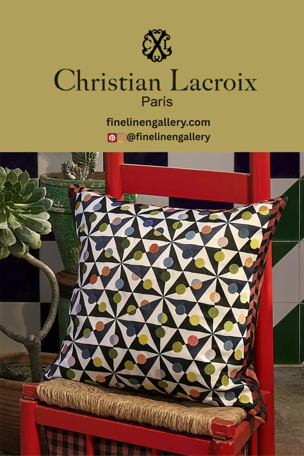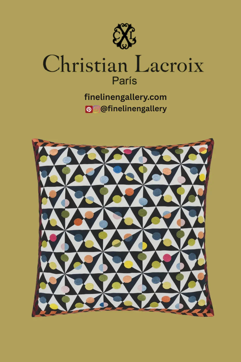 A graphic pattern, digitally printed onto cotton sateen, is highlighted with multi coloured embroidered polka dots in this stunning decorative pillow by Christian Lacroix Maison. Reversing to a graphic pattern on luxurious sateen.