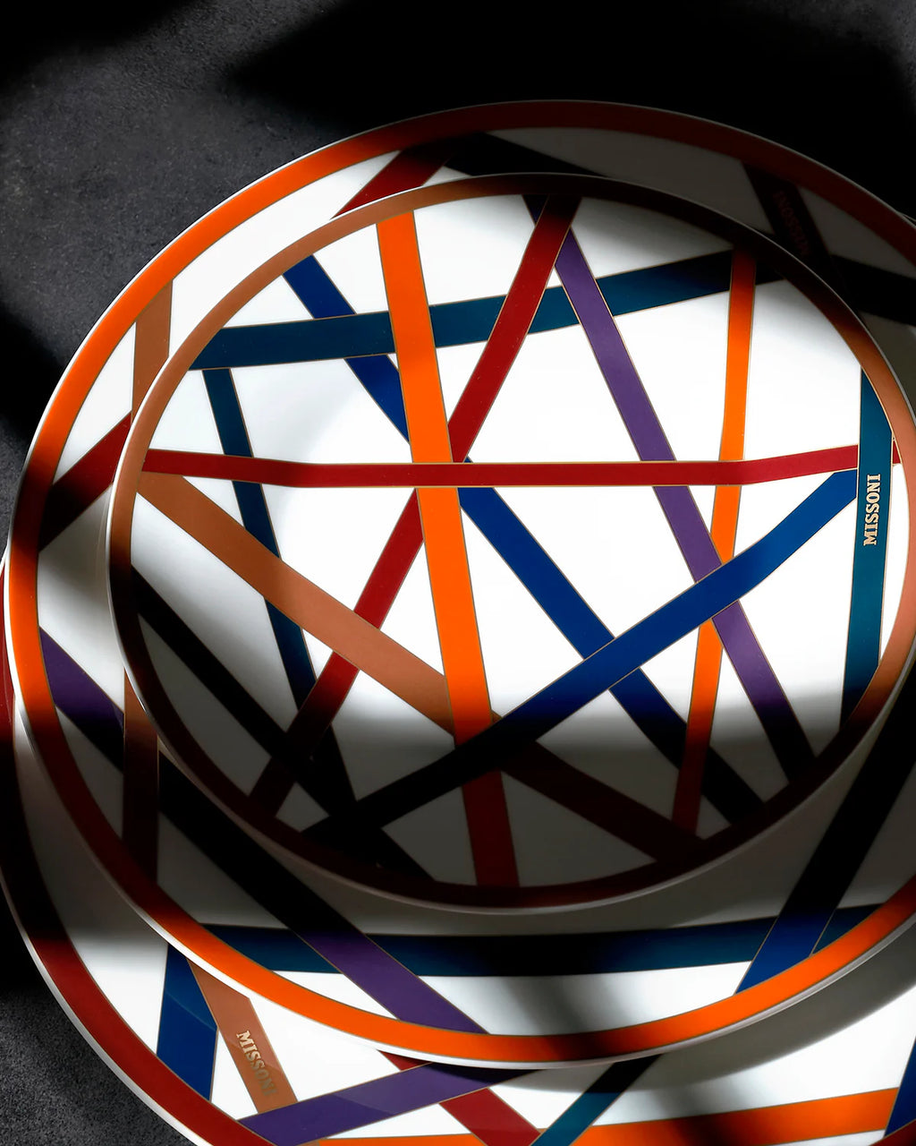 The Missoni Nastri collection is focused on these three aspects: harmony, classicism and elegance. Each item in the series is composed of harmonious interpretations between blue, bordeaux, purple, beige, green and orange, studied to create a symphony within the range of products.