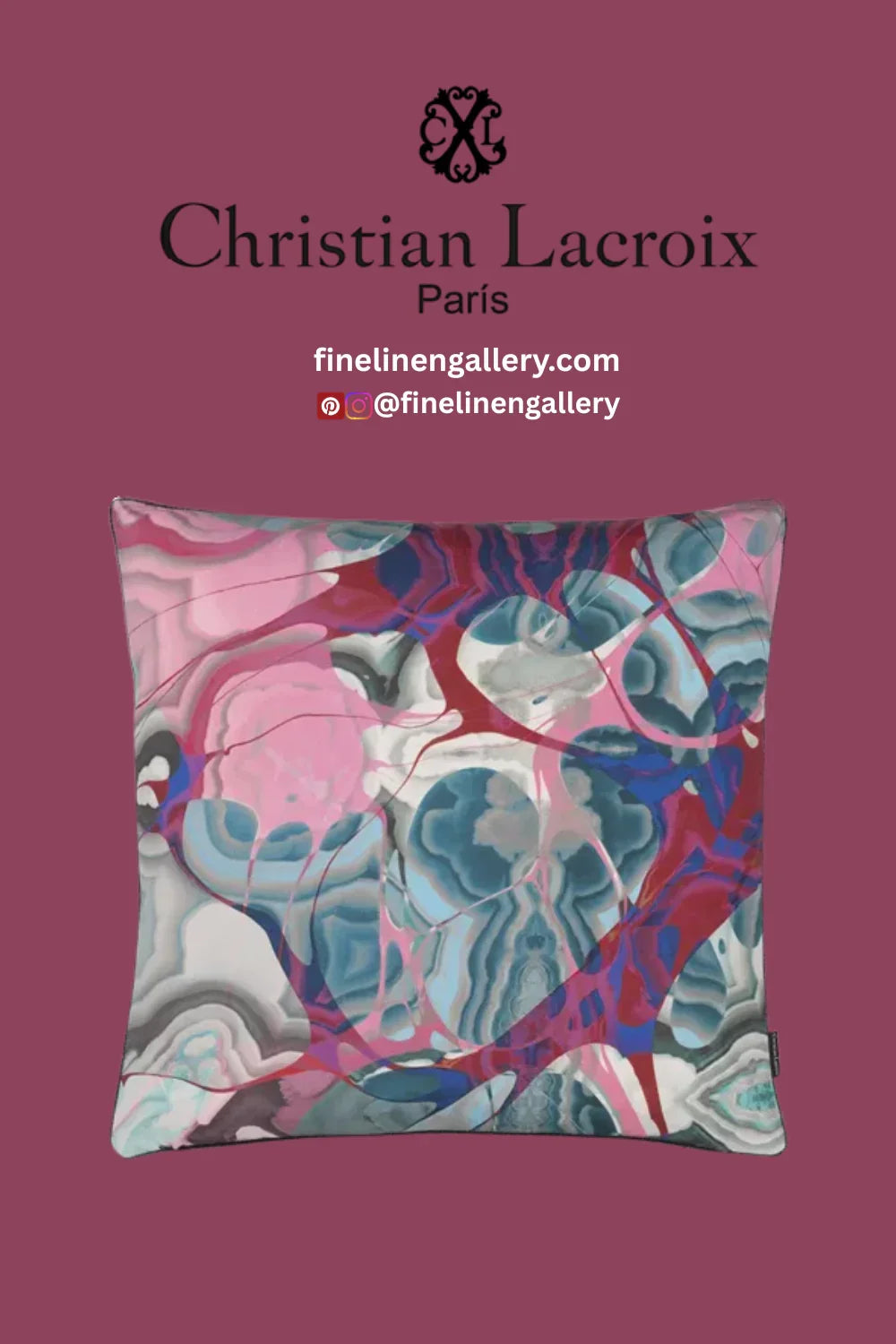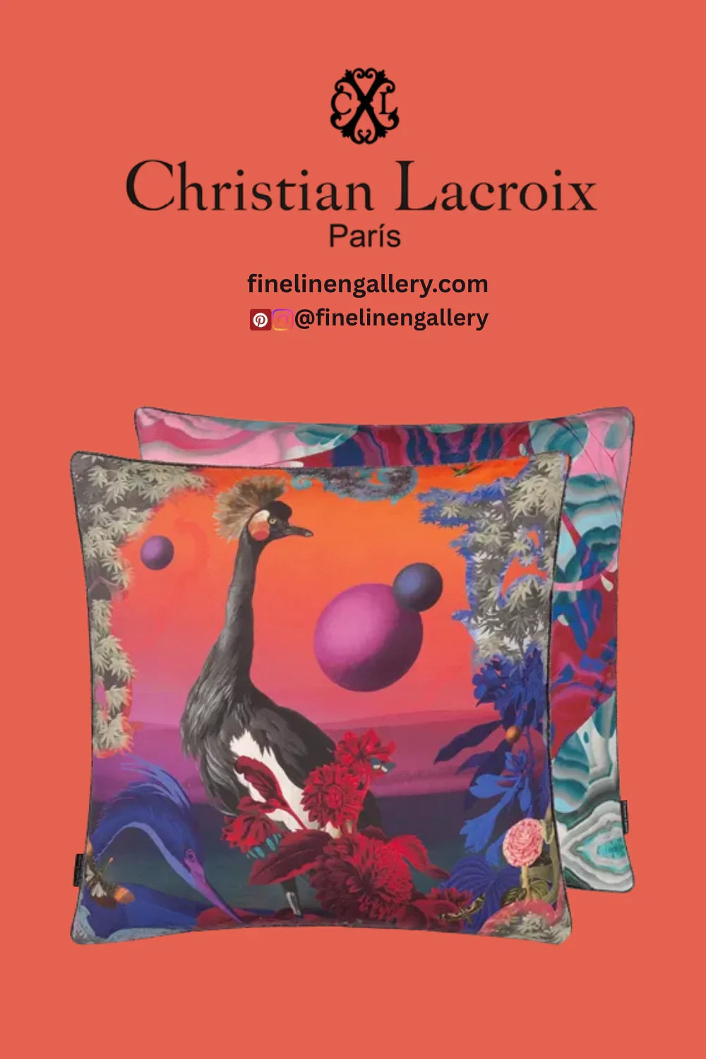 An imaginary spatial and baroque African scenic sunset with a dramatic peacock as the focus of this flamboyant collage style decorative pillow by Christian Lacroix Maison. Digitally printed onto cotton satin with a polychromatic marbleised reverse. Finished with a gunmetal lurex piping on all sides.