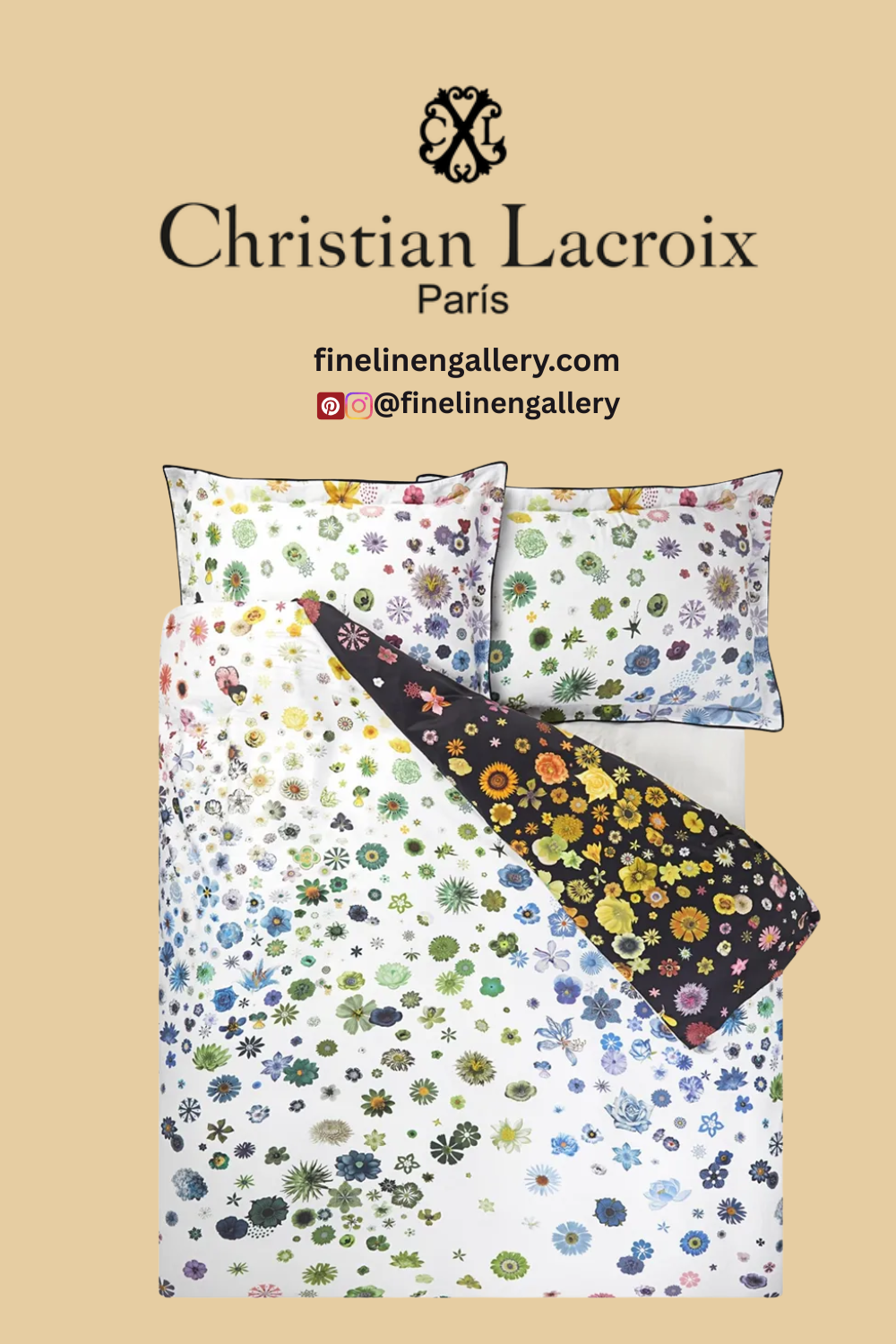 A multitude of small-scale flowers cascade in a myriad of vivid multi colours in this striking floral bedding design by Christian Lacroix. Digitally printed onto luxurious cotton sateen and fully reversible with black and white grounds. Completed with statement pillowcases and packaged in eco reusable fabric pouches with button closure.
