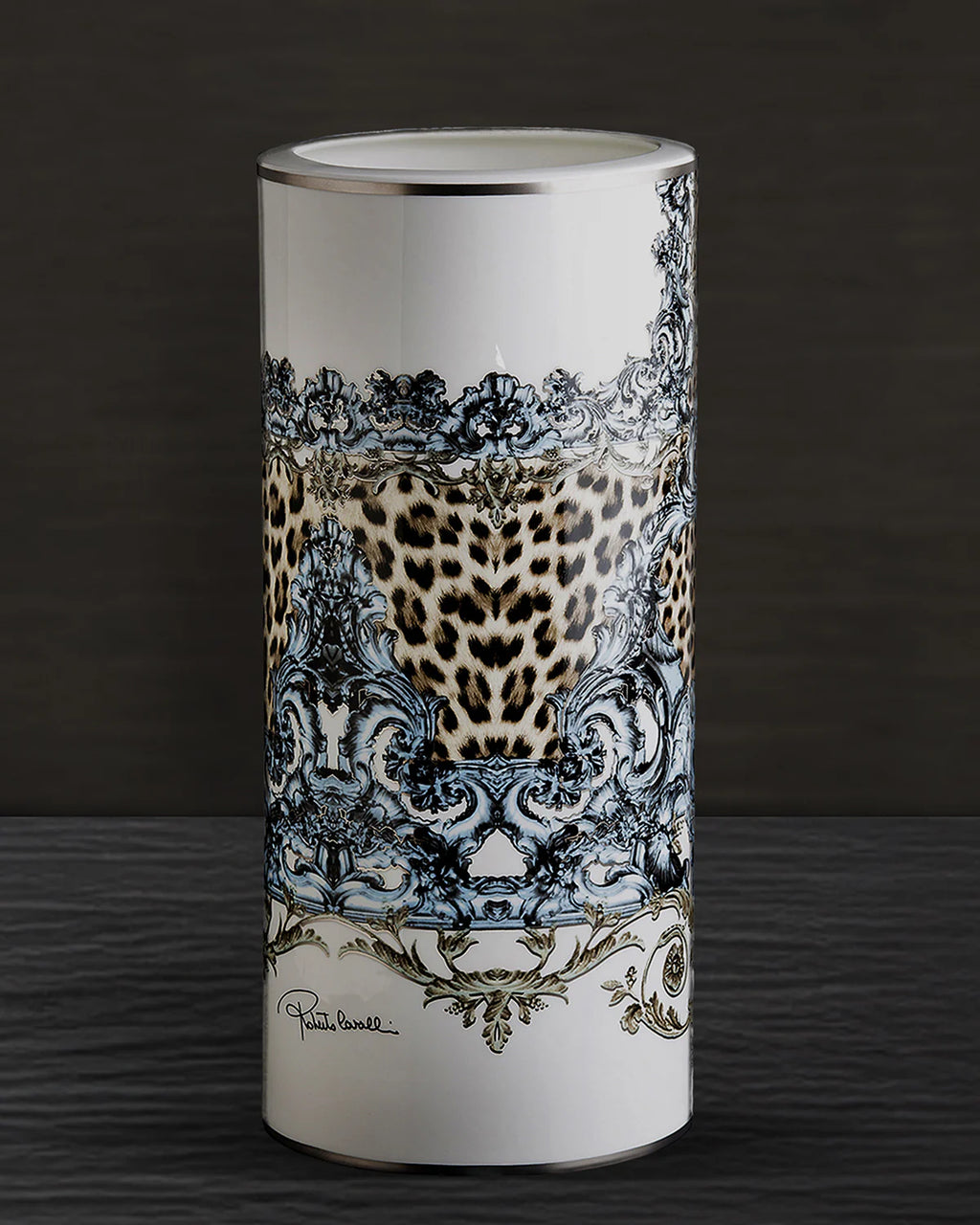 The Roberto Cavalli Home High Vase PALAZZO PITTI captures the grandeur of the Palazzo Pitti collection, inspired by the magnificence of the Florentine Renaissance palace. An expressive mix of classic florals and animalier motifs fills the surface with rich shapes and colors, celebrating Italian beauty and style with dramatic elegance.