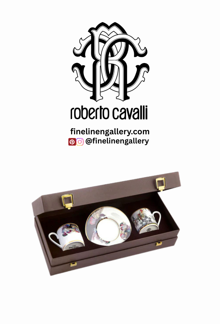 Roberto Cavalli Home Coffee Cup & Saucer FLOWERS Model C-E Set of 2 in Luxury Box reflects the vibrant essence of the Flowers collection, celebrating the colorful beauty of blooms and fruit. Delicate shapes and rich tones combine harmoniously, bringing expressive elegance and a blossoming sense of emotion to the table.