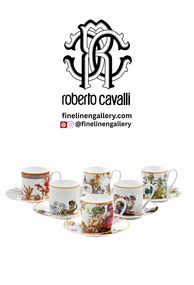 Roberto Cavalli Home Coffee Cup & Saucer FLOWERS Set of 6 in Luxury Box celebrates the vibrant spirit of the Flowers collection, where colorful blooms and fruit take center stage. Delicate forms combined with rich, expressive tones bring a blossoming elegance and emotional charm to the table.