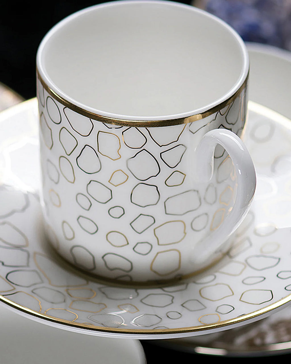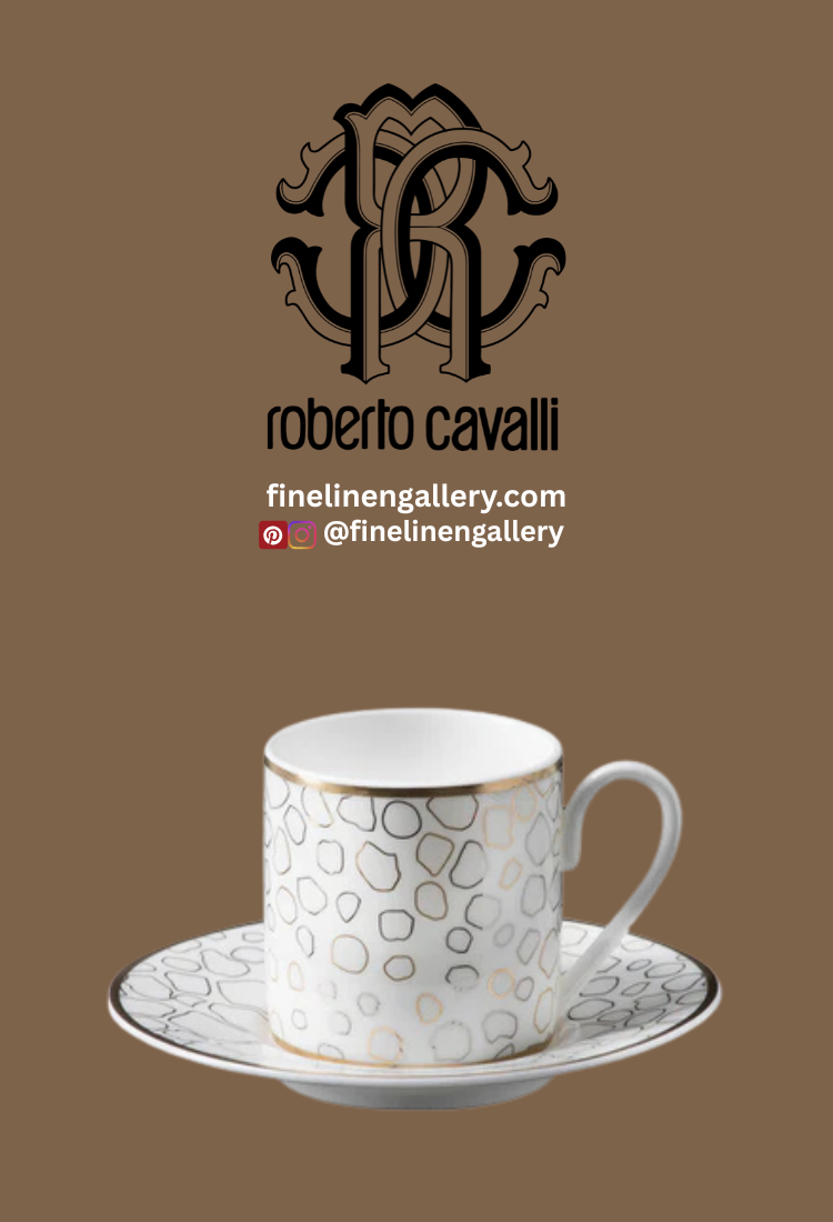 The Roberto Cavalli Home Coffee Cup & Saucer GIRAFFE Set of 2 in Luxury Box is crafted from pristine white bone china and distinguished by an elegant gold and platinum outline design. Finished with a refined gold rim and the signature Roberto Cavalli logo, it brings sophisticated elegance to the coffee ritual.