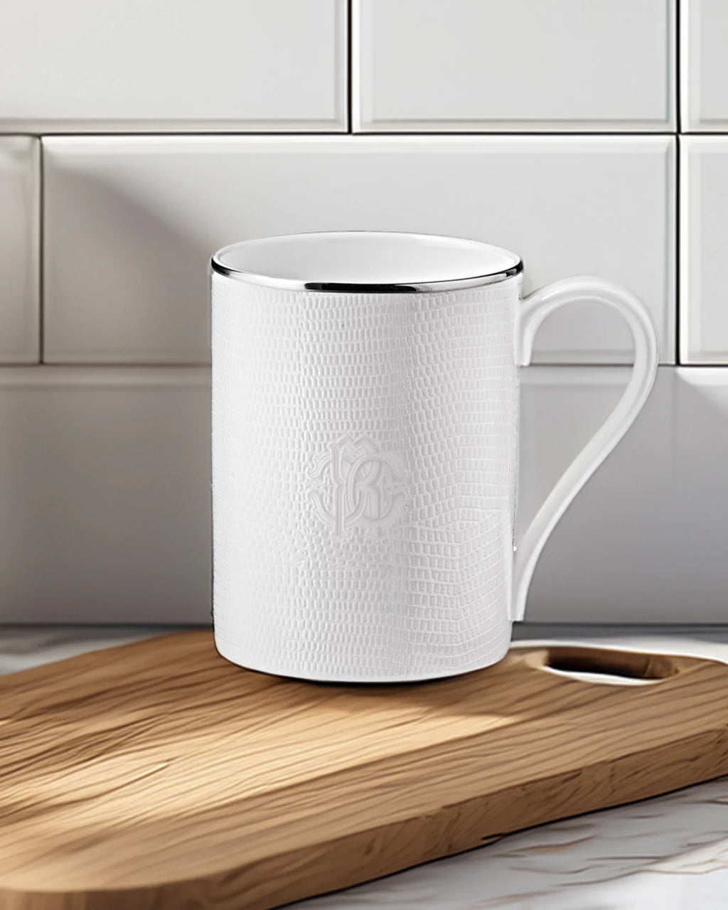 The Roberto Cavalli Home Mug Cup LIZARD PLATIN in Luxury Box showcases subtle extravagance through the Lizard Platinum collection. Embossed with a reptile-inspired texture in brilliant white and finished with platinum-toned rims and the Roberto Cavalli logo, it brings refined opulence to an elegant table setting.