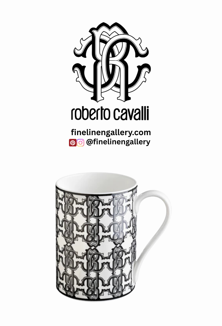 The Roberto Cavalli Home Mug Cup MONOGRAM in Luxury Box – Black reflects the bold elegance of the Monogram Black collection, translating the brand’s iconic haute couture flair into fine tableware. Defined by the simplicity of the two-letter logo, it offers a refined expression of luxury filled with allure and enigma.