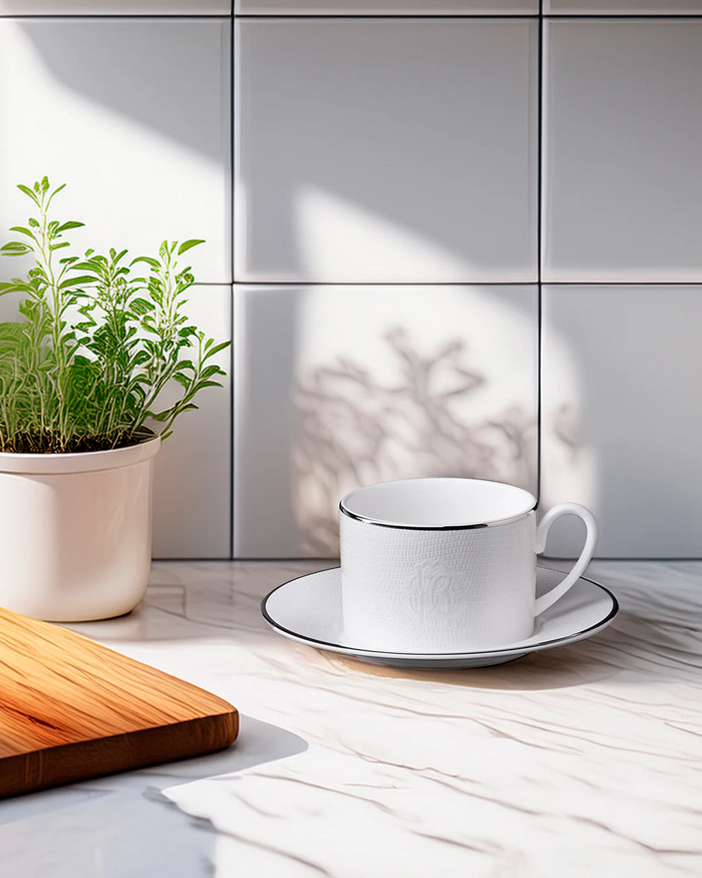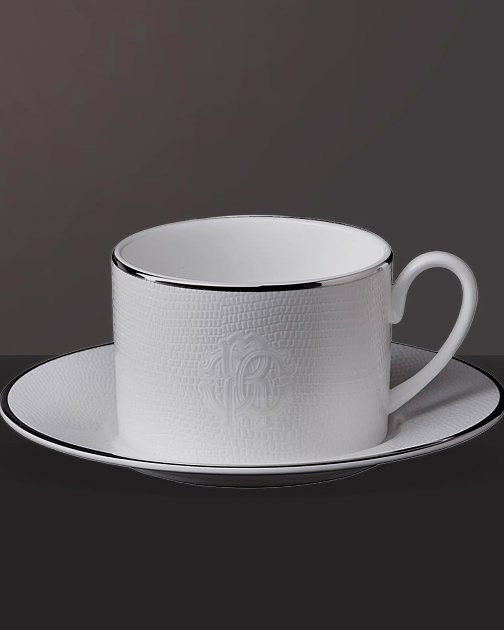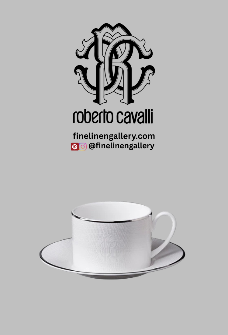 The Roberto Cavalli Home Teacup & Saucer LIZARD PLATIN Set of 2 in Luxury Box embodies subtle extravagance from the Lizard Platinum collection. Featuring a brilliant white surface embossed with reptile-inspired texture and finished with platinum-toned rims and the Roberto Cavalli logo, it adds refined opulence to the table.